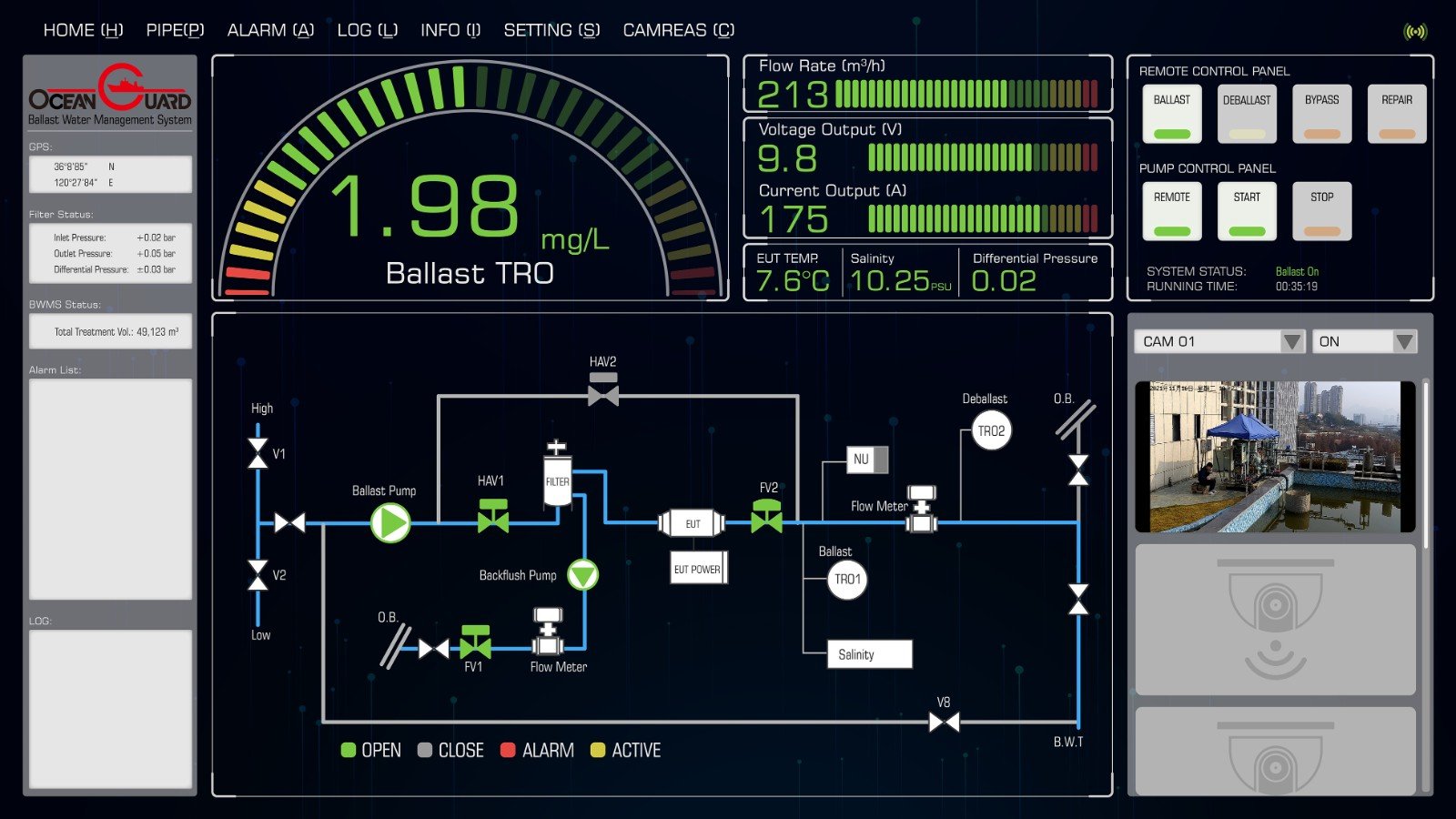 海洋衛(wèi)士?壓載水管理系統(tǒng)具備遠程控制功能,可與海德威智慧集成平臺實時互通,實現(xiàn)云端數(shù)據(jù)采集、系統(tǒng)操作與運行狀況診斷。