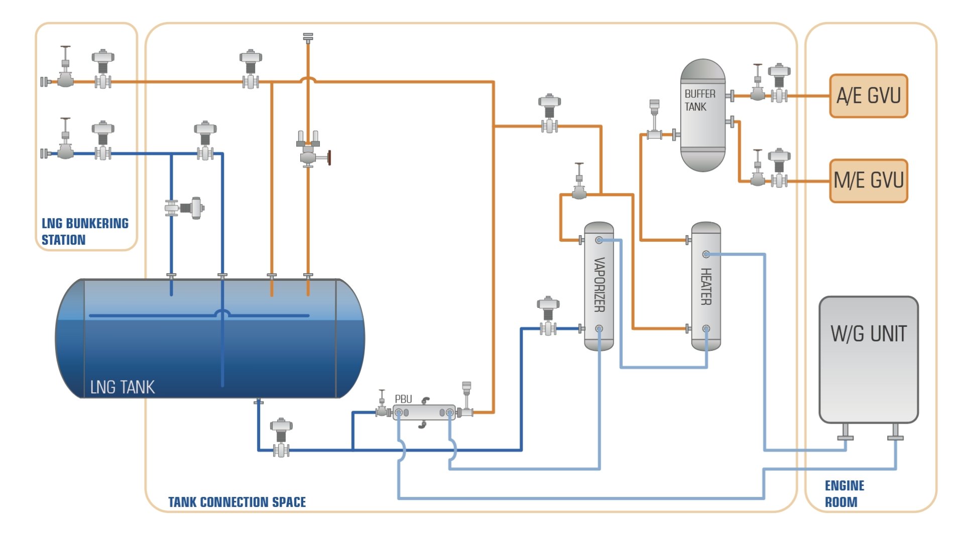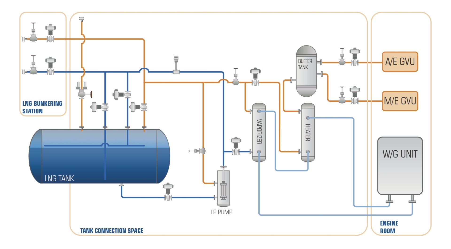 整個(gè)氣體工藝包采用定制化開發(fā)/模塊化設(shè)計(jì),可根據(jù)船舶布置實(shí)現(xiàn)布局的最優(yōu)化。天然氣經(jīng)中間介質(zhì)加熱,降低天然氣與熱源之間的交叉泄漏風(fēng)險(xiǎn),同時(shí)確保在不同航區(qū)不同環(huán)境條件下供氣系統(tǒng)和加熱單元的靈活性和穩(wěn)定性。